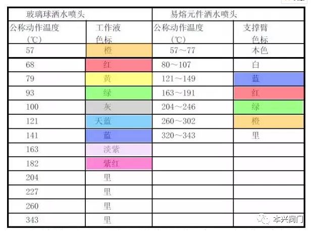 玻璃球洒水喷头的公称动作温度有13档,易熔元件洒水喷头的公称动作温度有7档。